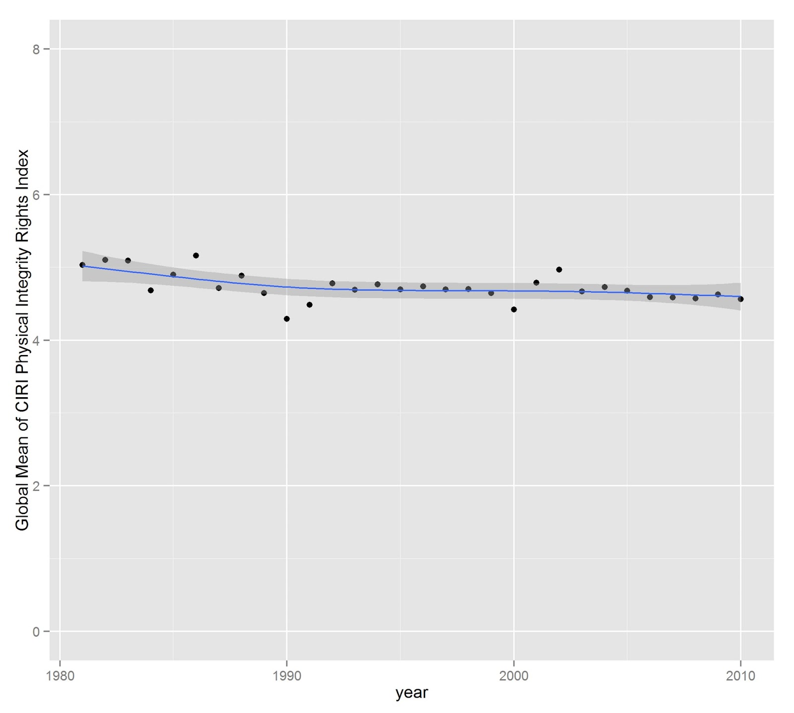 Figure 1. Global mean of the CIRI Physical Integrity Index,  1981-2010 (higher means more protection of physical integrity rights, on a 0 to 8 scale)