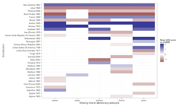 But though there is much less consensus about these other rights, it is nevertheless striking that public affirmation of any set of these rights is not obviously clustered in particular societies either. It isn't always clear why a society chooses to “constitutionalize” a particular right, and publicly affirm it in its highest legal document; but whatever the case, democracies and non-democracies are about equally likely to endorse a given right in their constitutional documents. As we see above, the average UDS score of countries endorsing any particular right is pretty much the average level of democracy in the sample, at least for provisions endorsed by, say, more than 10% of the world's constitutions.(We can also see this by noticing that of the fireworks above are especially red or especially blue, save for rights explicitly endorsed by very few countries, like the right to bear arms - USA, Mexico, Guatemala - or the provisions specifying that law contrary to religion is void). Furthermore, there is no correlation between the number of rights provisions endorsed by a constitutional document and either the contemporary or long-run level of democracy, as measured by the UDS score or the cumulative UDS score. In fact, constitutions in general seem to be fairly similar to one another; and to the extent that particular sets of constitutions cluster together (grouping together countries that affirm similar sets of rights) these clusters do not correspond to obvious cultural, political, or other groupings.