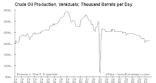 Dunning was writing in 2007, so he cannot address every development of Venezuelan politics since then, but he does argue that Chavez’ redistributive rhetoric has tended to “bite” more – there have been more expropriations, for example – when the price of oil declined, and it has tended to remain mere rhetoric when the price of oil was high. (There are some complications here, since the price of oil is not an exact measure of the oil-related resources available to the Venezuelan state, but you should read the book if you are interested in the complications). The upshot is that if the Venezuelan state’s take from oil is declining, perhaps because petroleum production is declining (as it seems most analysts agree: see also chart below) and oil prices decline or fail to rise sufficiently to compensate for the decline in production, we should expect to see more class conflict, and potentially more authoritarianism from the Chavez regime. So high oil prices (so long as there is enough oil production) moderate actual redistribution and authoritarian temptations (though not necessarily redistributive rhetoric), whereas low oil prices increase actual redistribution and authoritarian temptations (on both government and opposition sides: the coup attempt of 2002 is explained by Dunning in part as a result of higher redistributive pressures on the elite due to a fall in oil revenues).