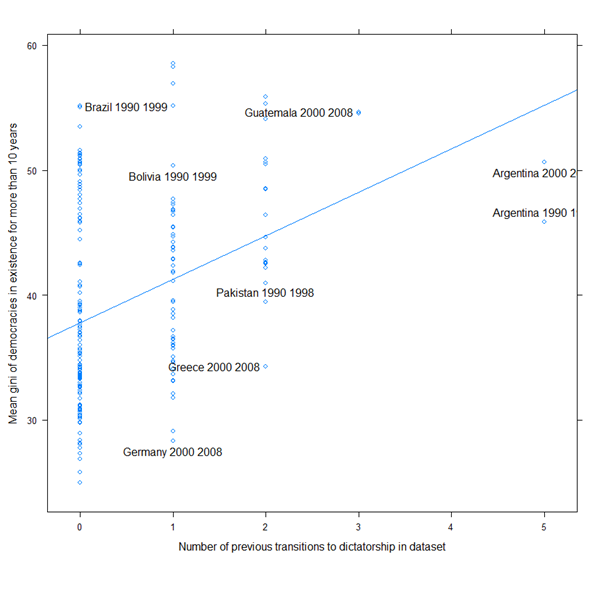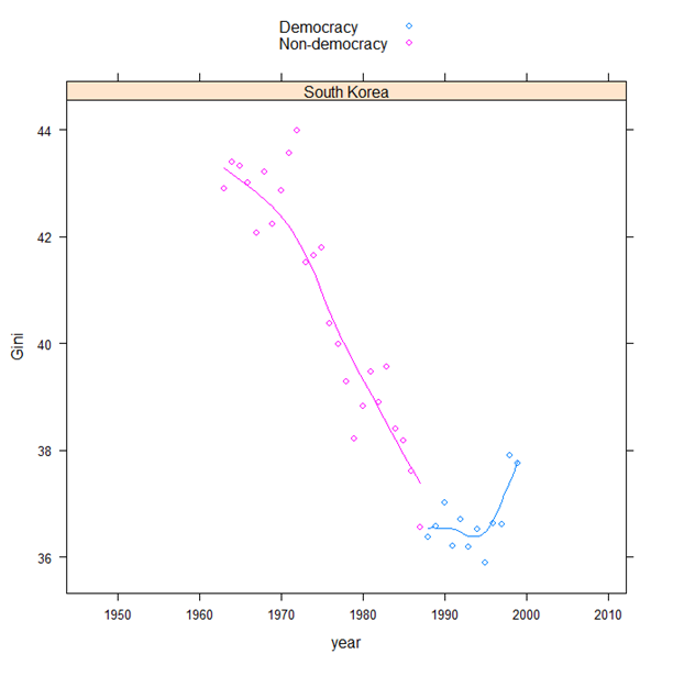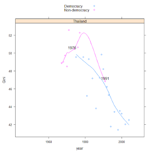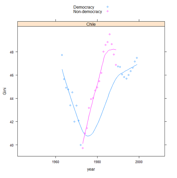 (I've deleted cases with very few data points to make the graph look prettier. See the code for the details). What is striking about this graph is how stable the redistributive capacity of most states has remained over a period of more than six decades: many countries show basically zero change in their ability to change the income distribution. To be sure, some countries have increased their redistributive capacity -- France is a good example -- and others experience wild swings in redistributive capacity, probably related to big political conflicts -- note Bangladesh and Chile, the latter with a big bump around the time of Allende. But at best we can detect a long-term decline in redistributive capacity for the majority of cases (even if the decline is often slight); and often, after a decline, we see long periods of stability rather than change: countries settle into an "inequality regime," with some occasional big bumps which indicate new equilibria.